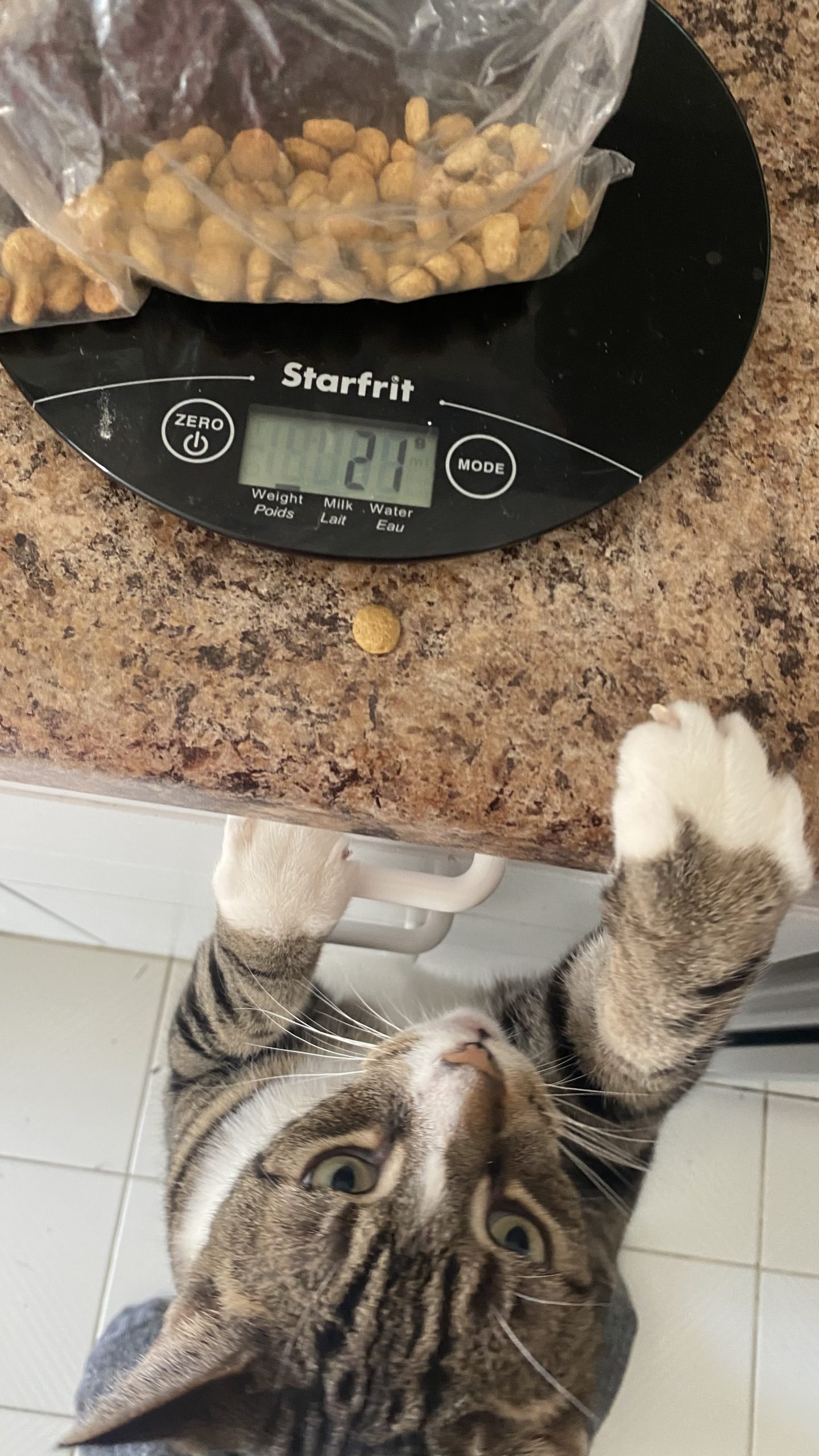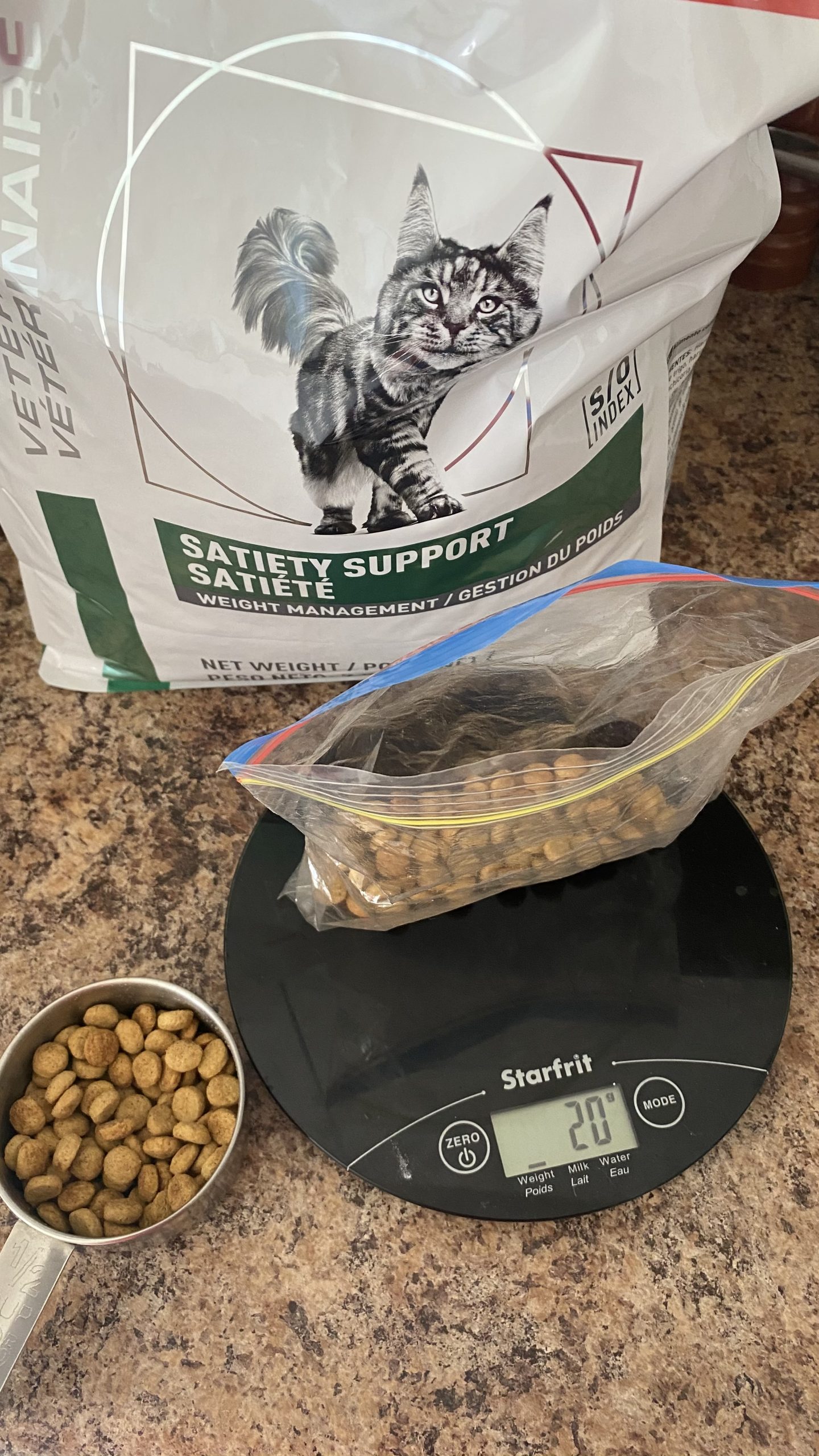 Your veterinary team can calculate the amount of food you should be feeding your porky kitty in grams or ounces. It’s important that you don’t guesstimate this amount at feeding time. I use a food scale to measure out my kitties’ portions for each meal and I recommend that you do the same!